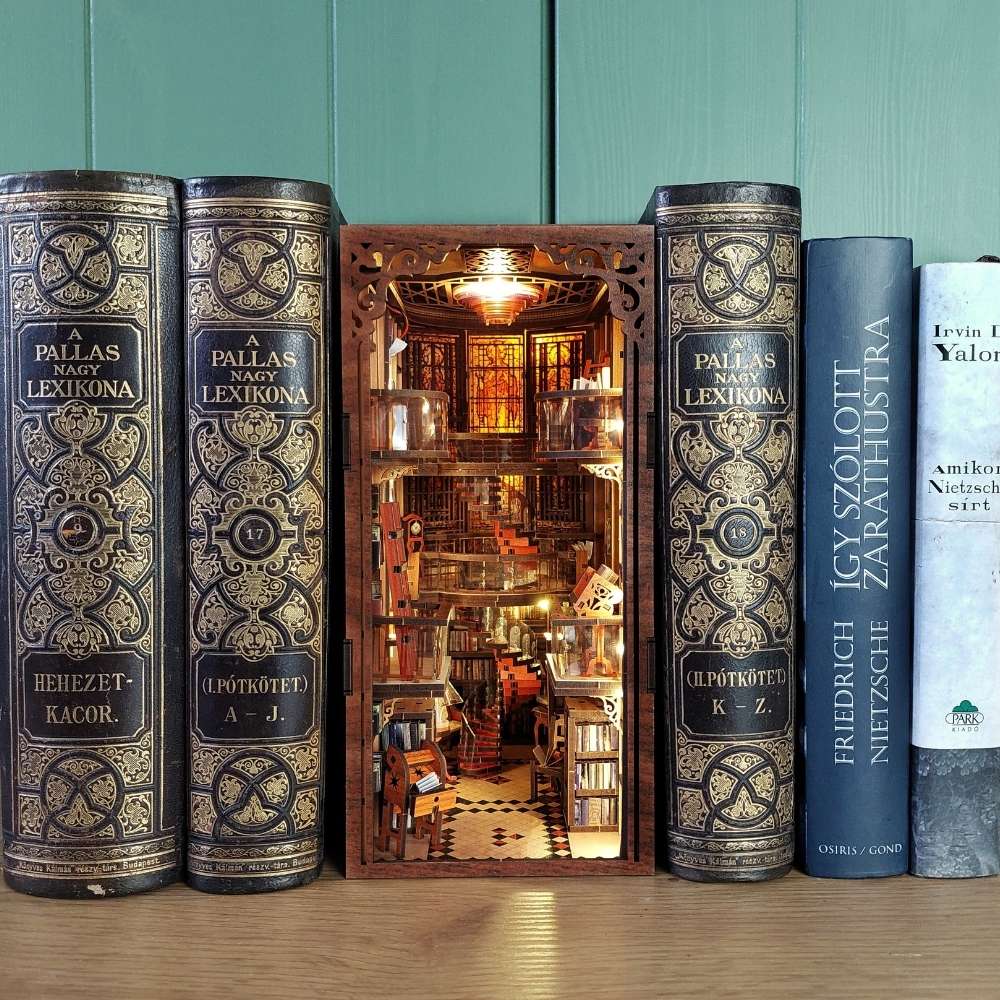 A Könyvkuckók aprólékosan kidolgozott, miniatűr jeleneteket ábrázoló diorámák. Az apró kis elemekből — ahogy szépen lassan összeállnak a kezed alatt — kibontakozik egy varázslatos világ, amely egy regény vagy a képzelet birodalmának egy részletét kelti életre. Az olvasósarkodban elhelyezve, mintha egy másik világra nyílna ajtó a könyveid között.